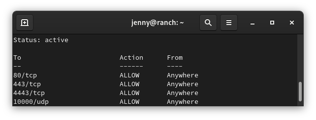 sudo ufw status numbered Status: activeTo Action From-- ------ ----[1] 3478/udp ALLOW IN Anywhere [2] 5514/udp ALLOW IN Anywhere [3] 8080/tcp ALLOW IN Anywhere [4] 8443/tcp ALLOW IN Anywhere [5] 8880/tcp ALLOW IN Anywhere [6] 8843/tcp ALLOW IN Anywhere [7] 6789/tcp ALLOW IN Anywhere [8] 27117/tcp ALLOW IN Anywhere [9] 22/tcp ALLOW IN Anywhere