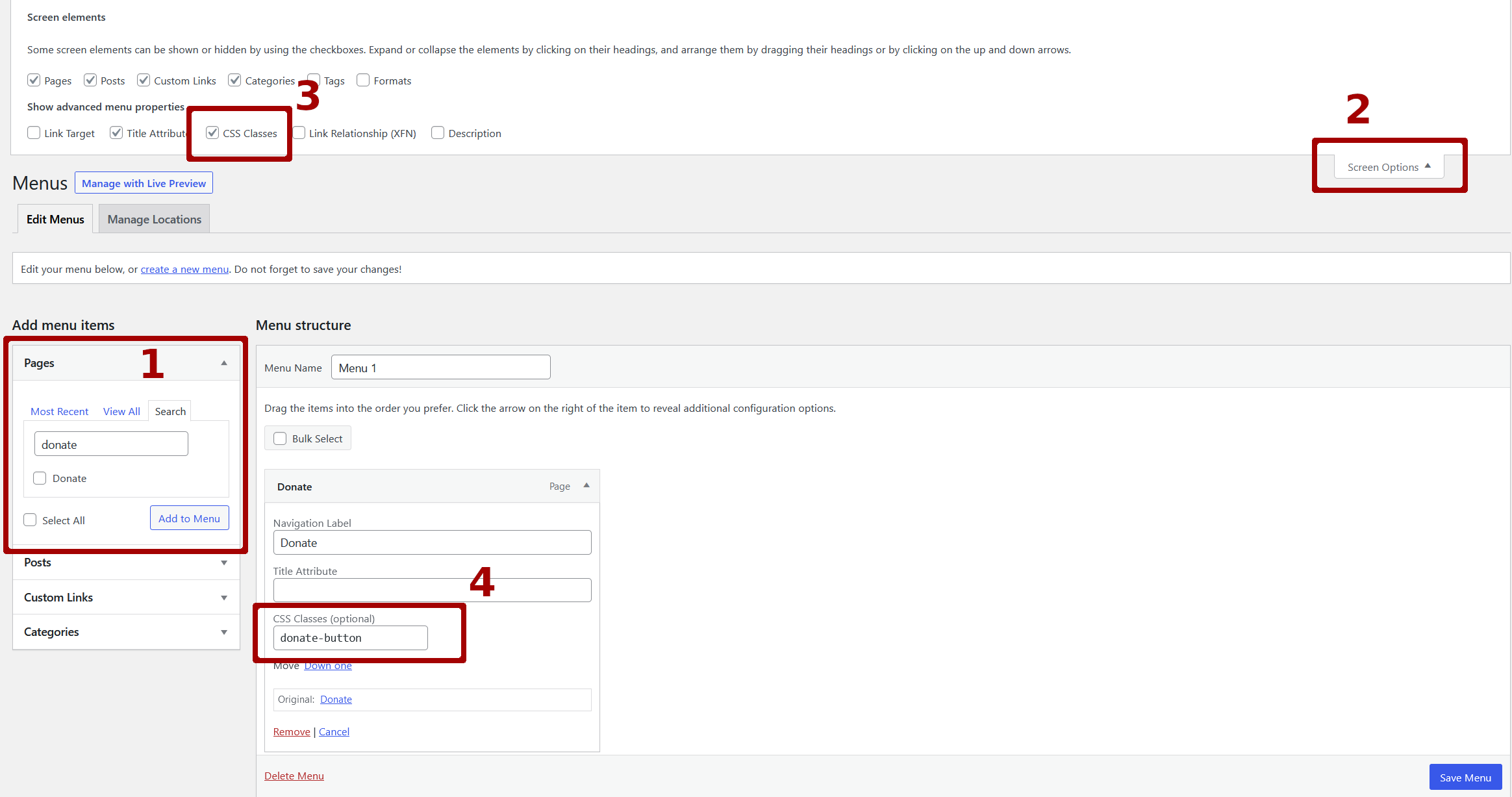 - Under the Menu option, set a CSS class. (Name it something unique so it doesn’t interfere with other CSS classes. We’ll configure the CSS in the next step)