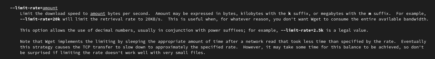 --limit-rate=amount        Limit the download speed to amount bytes per second.  Amount may be expressed in bytes, kilobytes with the k suffix, or megabytes with the m suffix.  For example,        --limit-rate=20k will limit the retrieval rate to 20KB/s.  This is useful when, for whatever reason, you don't want Wget to consume the entire available bandwidth.        This option allows the use of decimal numbers, usually in conjunction with power suffixes; for example, --limit-rate=2.5k is a legal value.        Note that Wget implements the limiting by sleeping the appropriate amount of time after a network read that took less time than specified by the rate.  Eventually        this strategy causes the TCP transfer to slow down to approximately the specified rate.  However, it may take some time for this balance to be achieved, so don't        be surprised if limiting the rate doesn't work well with very small files.